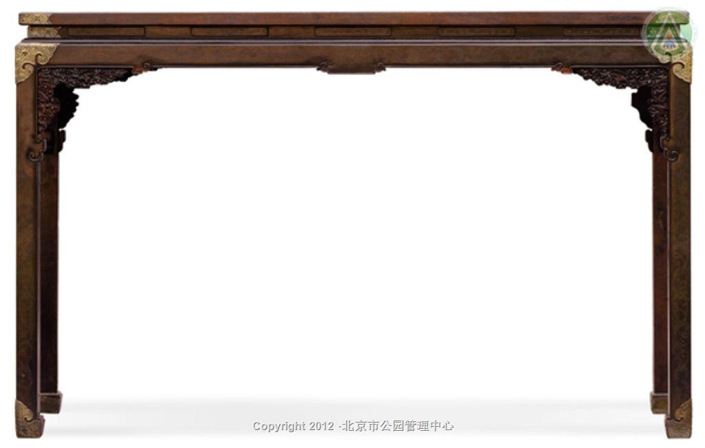 素面攒芯板,高束腰,马蹄腿带花牙,腿足牙板边缘起阳线,下装浮雕云蝠纹坠角,寓意福从天降。此桌在装饰手法上有两处点睛之笔:一,在桌面边抹四角以及束腰四角装铸铜鎏金花卉纹包角,在桌腿与牙板相交的三碰肩处安铸铜鎏金花卉纹云头披肩,四足套铸铜花卉纹云头铜靴。此种做法增加了桌子的坚固程度又使色彩更加华美。二,在桌面边抹、束腰、托腮以及腿足等重要部位都镶嵌细银丝,构成了完美的图案。此桌制造工艺考究,装饰手段复杂,尤其是铜活安装位置借鉴了石雕装饰风格,让人耳目一新,可充分领略皇家气派。