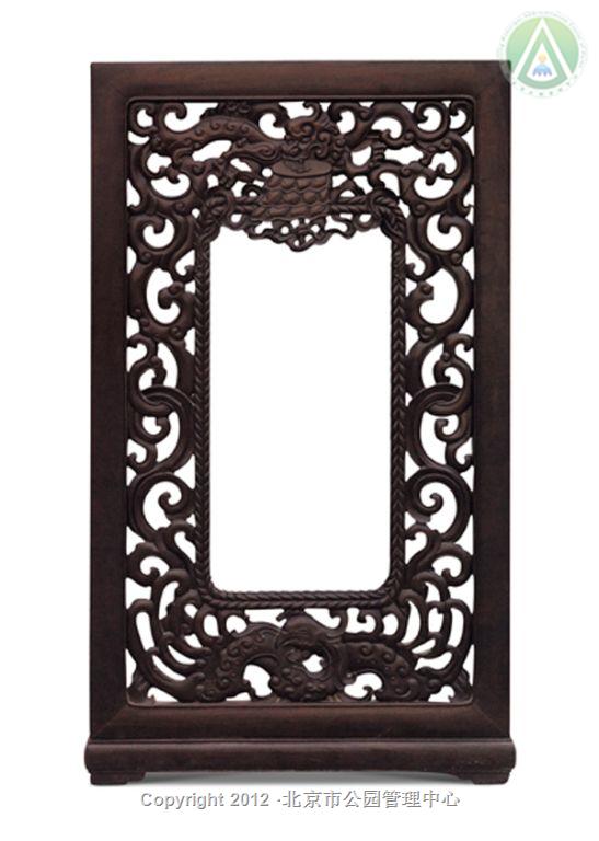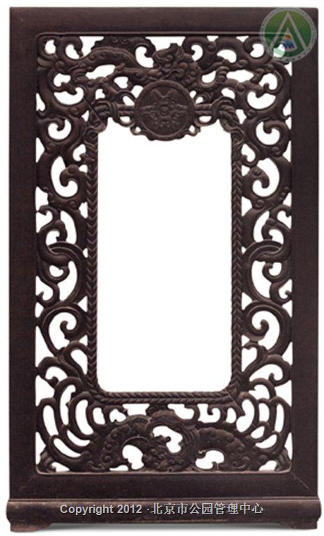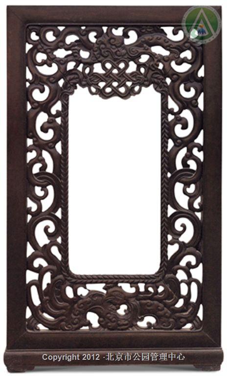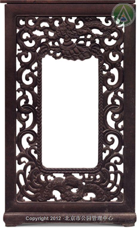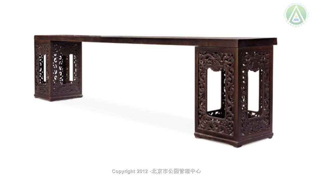 架几案采用紫檀制成,尺寸硕大,殊为难得。两个架墩攒框装八块厚紫檀板,施以透雕。每块花板除了龙凤及绳纹外,还雕有轮、螺、伞、盖、花、罐、鱼、肠八吉祥图案。此案造型规整,雕工精细,纹饰生动,为清宫紫檀重器。