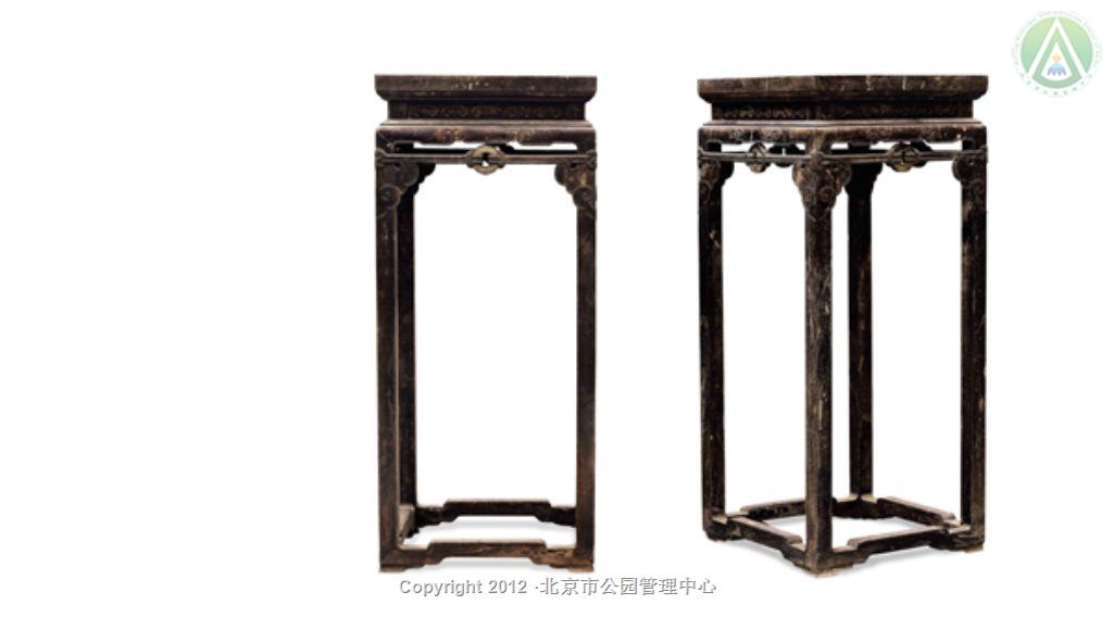 长、宽各41厘米 高93厘米攒芯面板,束腰铲地浮雕宽皮条线构成的如意云头纹。腿和牙板圆角相接,边缘均饰以婉转自如的宽皮条线。腿的上部用大料挖缺做成云纹状,绳牵玉璧纹横枨雕饰的绳纹一直向两侧延伸,并与另一侧的横枨在转角处盘结成扣,形象逼真,绞结有力。这种做法雕刻难度较大。花几装有罗锅式管脚枨,下设龟脚。清代宫廷家具常用绳纹作为装饰,如运用得当则给人以新奇清雅之感。