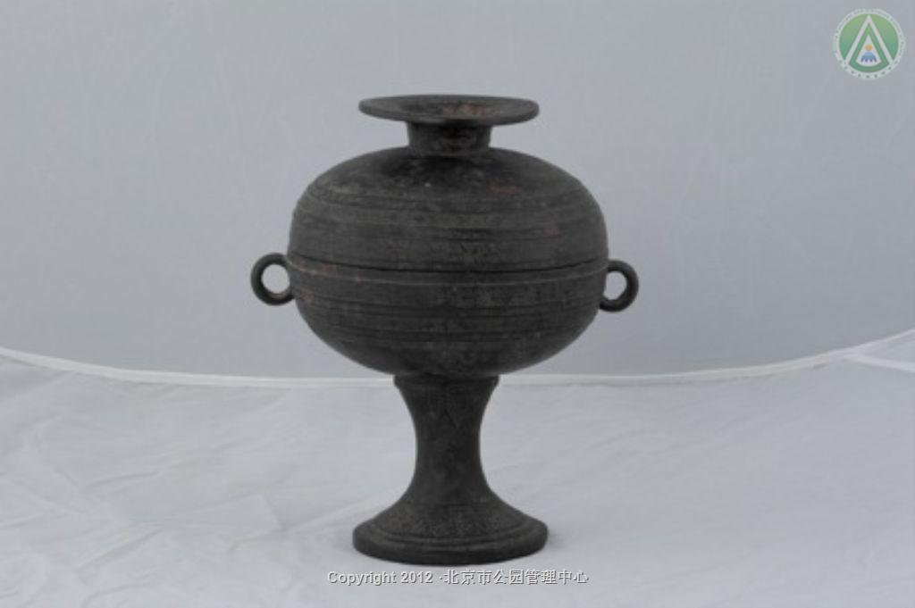 圆腹,高柄,圈足。腹饰对称的环耳。器身饰多道弦纹,腹饰回纹。