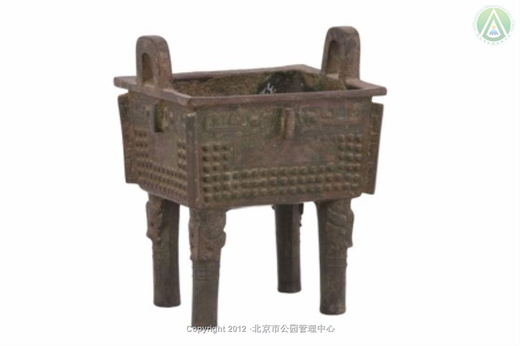 鼎身呈长方形,折沿,深腹,双立耳,四柱足。四角出棱脊,口沿下饰云雷纹,云雷纹上饰夔纹。器身四壁饰有带状乳丁纹,内壁铸有“丙父已”三字铭文。足饰兽面纹。