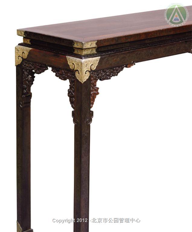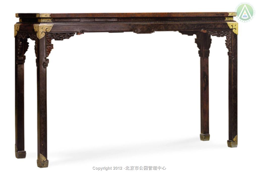 洼面束腰,加矮佬,开鱼门洞。牙板圆润光滑。横枨在中间部位拱起两处罗锅,如水而泛起两圈涟漪,顿生新奇之感。三个拐子纹卡子花。营造出空间节奏的横枨的两端从外观上看,并不直接与案腿相交,而是先转折向上行,再迂回至桌腿,并最终和与牙板棕角相接的立柱共同构成直角形桌腿,直通到地。此桌设计新颖,造型别致,构思巧妙,在所有边缘和棱角处都铲地起阳线,工艺考究,可称清宫家具中成功的创新之作。