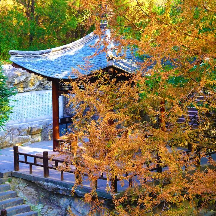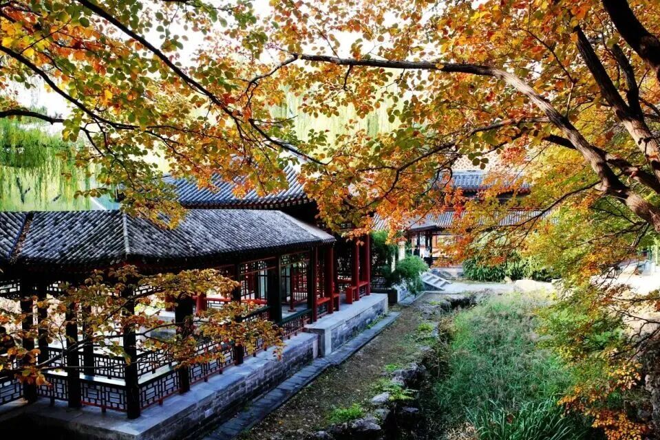 谐趣园涵远堂东侧、西侧土石结合的假山上自然生长数十株北京乡土树种大果榆,秋色叶由橙色-红色-棕红色逐渐变化,与古建搭配,拍摄效果非常上镜。