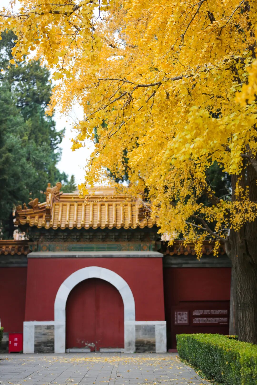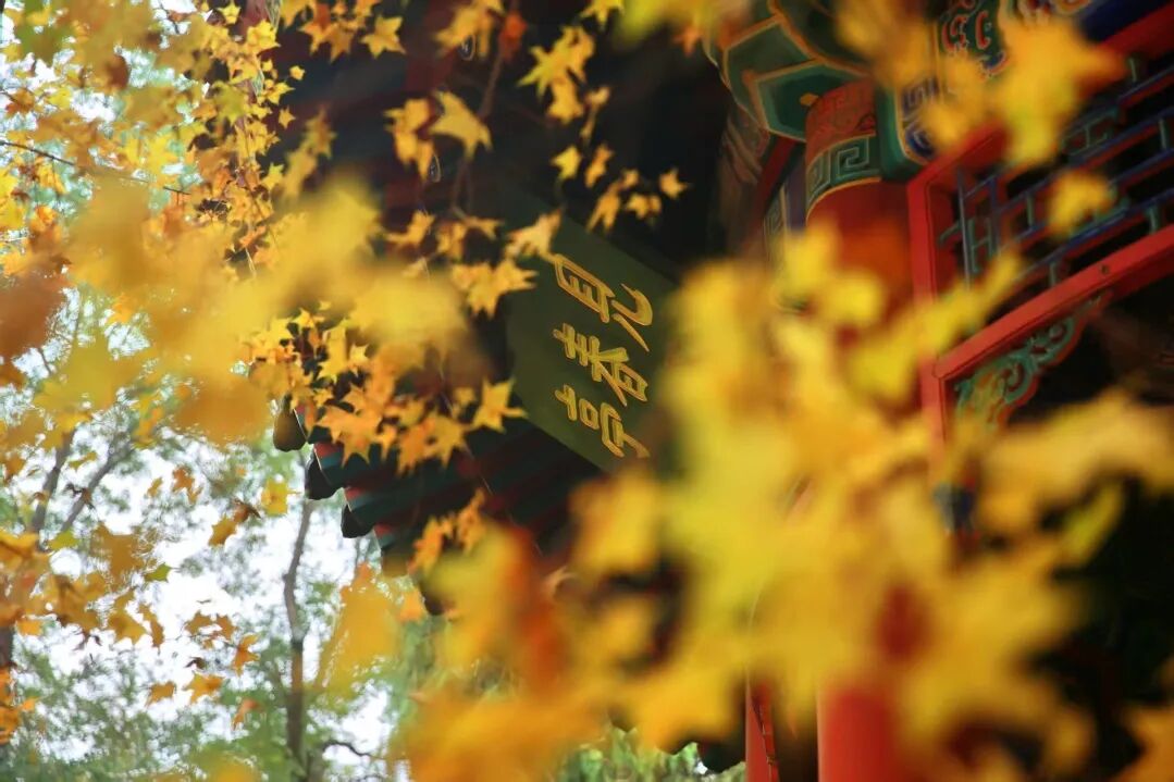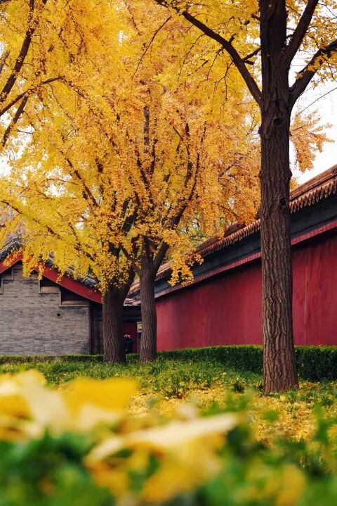 银杏树形高大,挺拔壮观,叶片形状如折扇,入秋叶子逐渐由绿色变为黄色,目前正呈现出漂亮的渐变颜色。金色的银杏叶与红墙古建相得益彰,颇有古韵秋色。