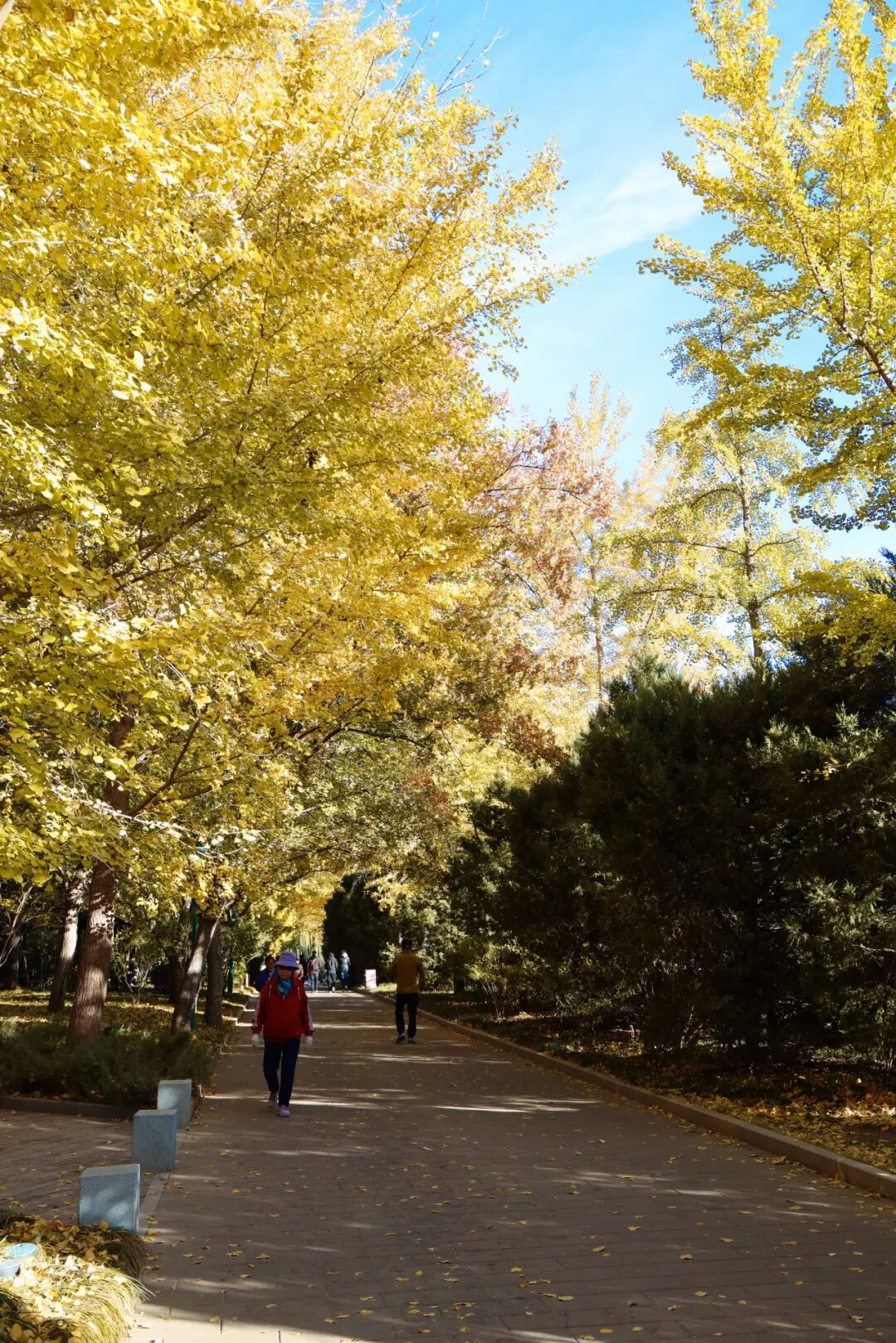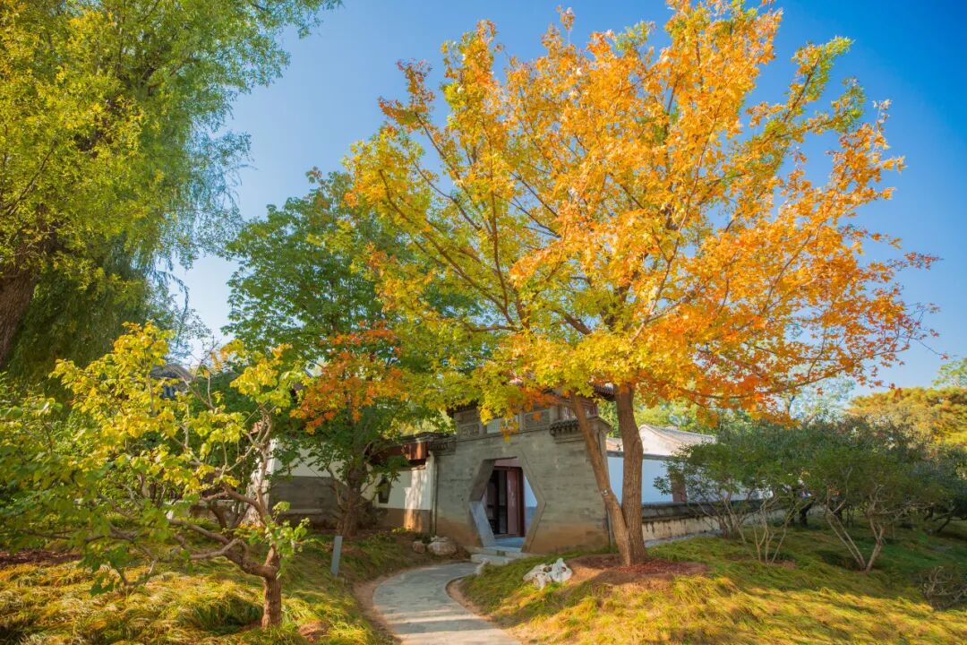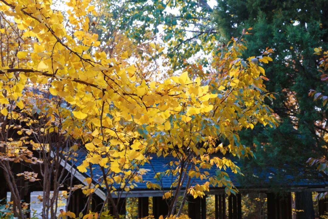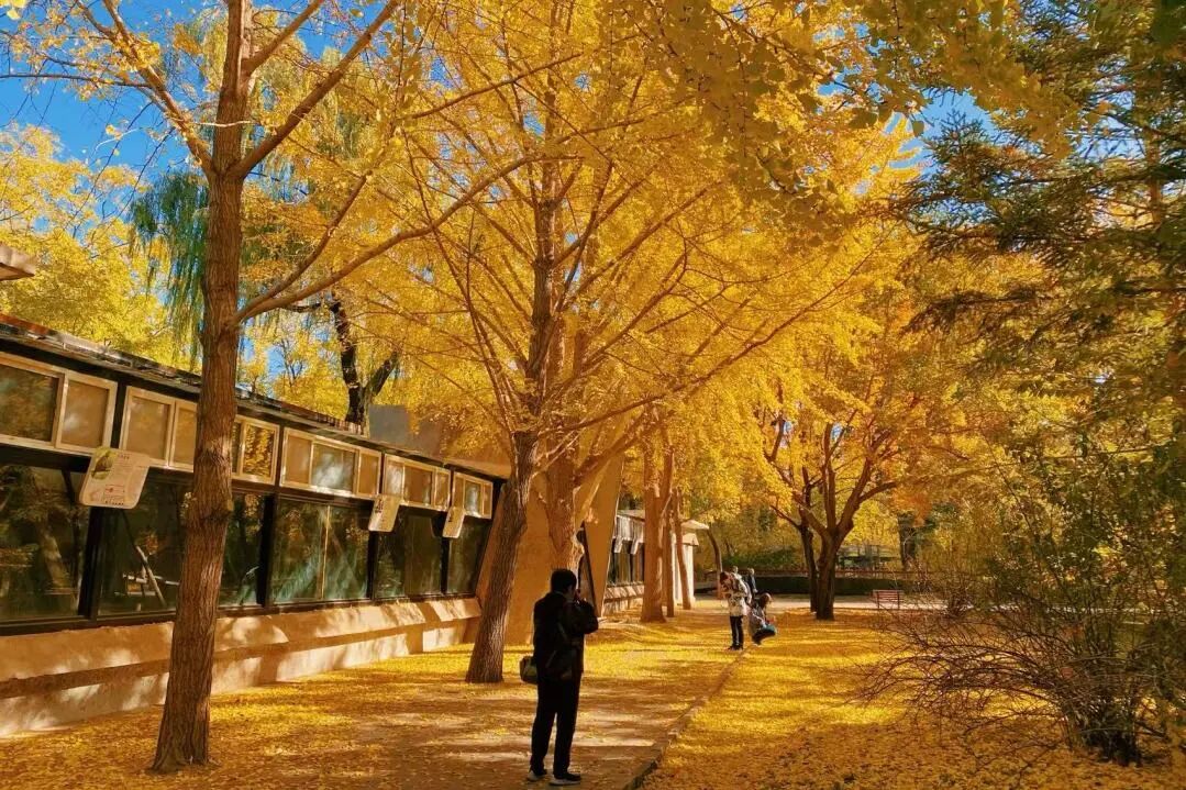 银杏林依廊而植,高大舒展的枝叶在空中交织成一片绵密的叶网。漫步林间,金黄色的叶片在湛蓝天空的映衬下铺展成画。