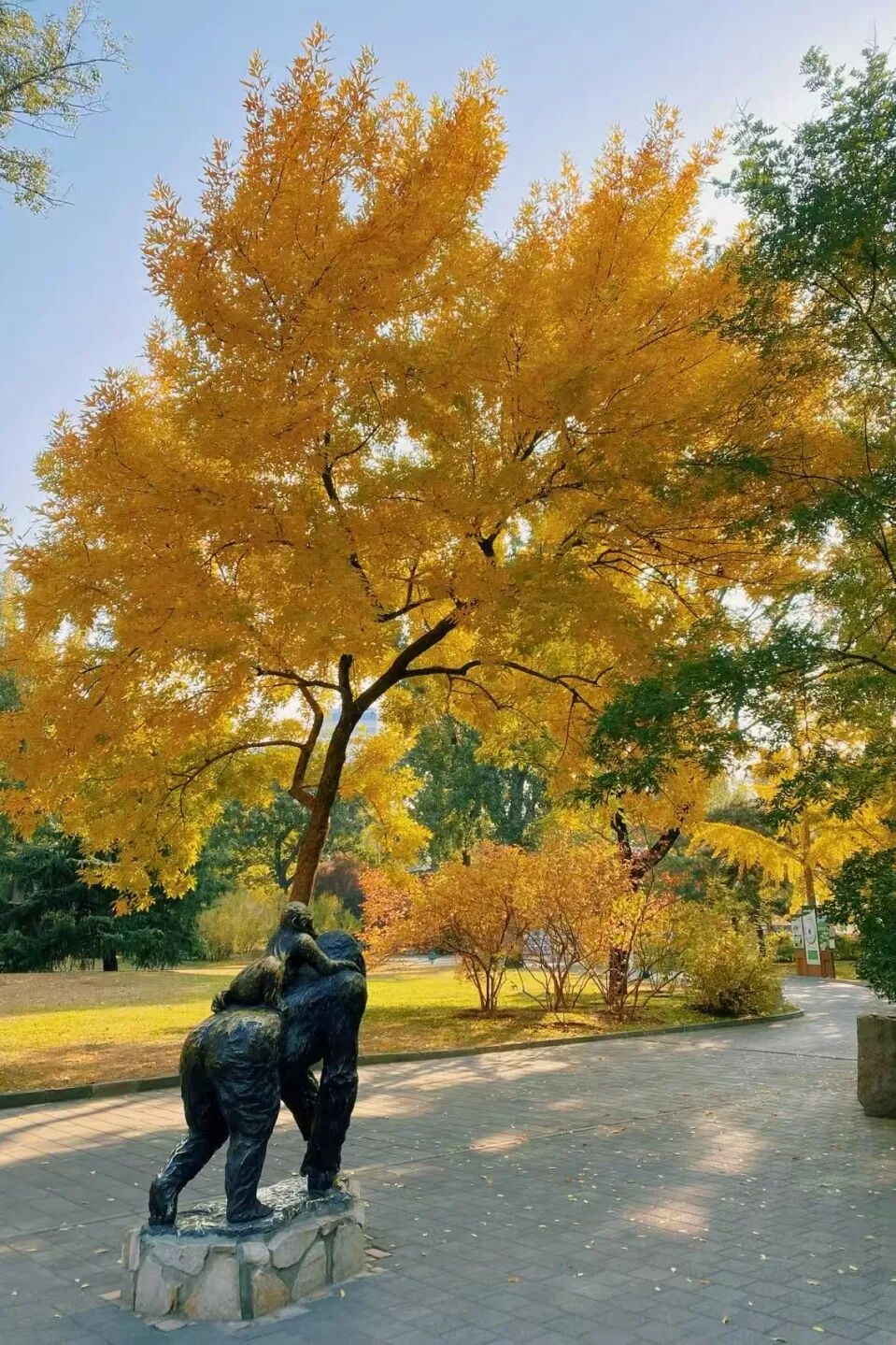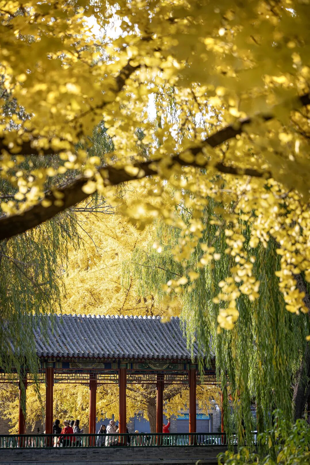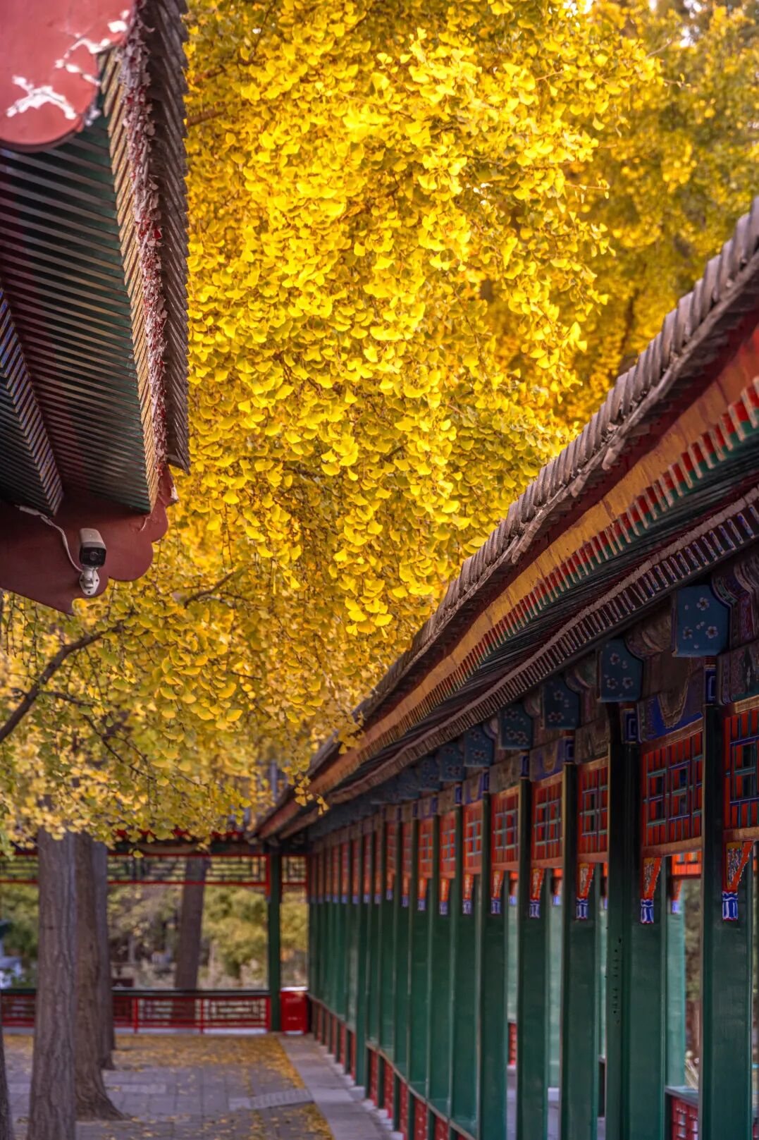 银杏林依廊而植,高大舒展的枝叶在空中交织成一片绵密的叶网。漫步林间,金黄色的叶片在湛蓝天空的映衬下铺展成画。