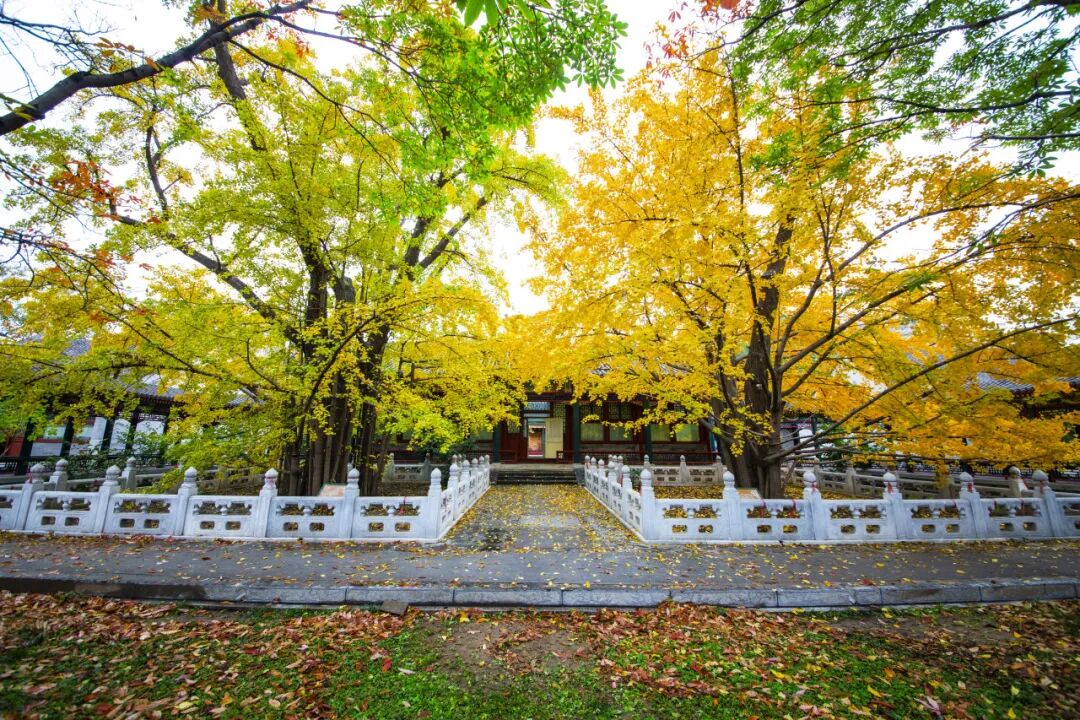 院中静立着两株四百余岁的古银杏,每当金秋时节,披满金灿银杏叶的古银杏在四周古建筑群落的环绕映衬下蔚为壮观。
