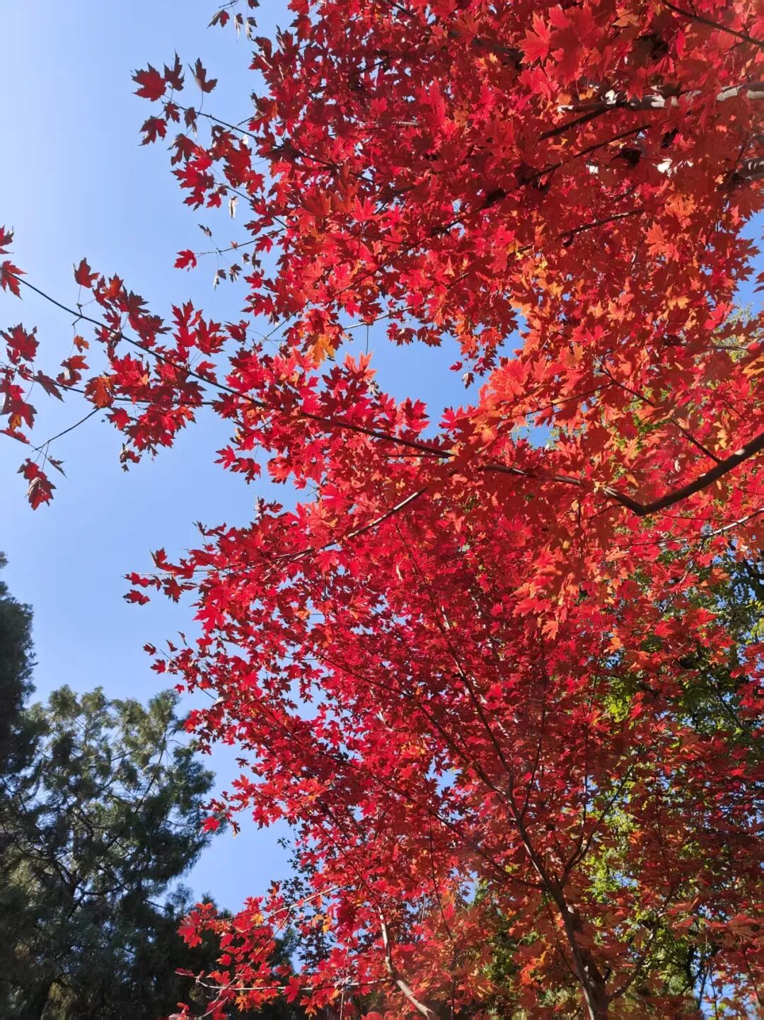“秋火焰”如其名般在秋天展现出炽热如火的红色。它的色彩饱和度高且整齐划一,树形优美丰满。在3号路入口处,每年送来热烈的红色秋意,迎接游人的到来。