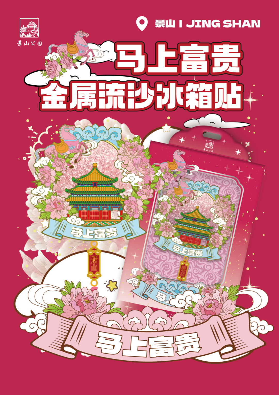 这款马年新品冰箱贴上,春日盛放的牡丹环绕万春亭,粉韵骏马踏云而来