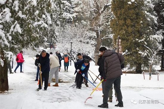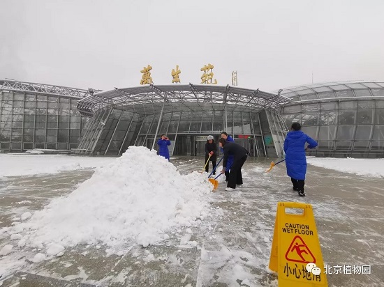 为保障游客游园安全,北京植物园全体400余名职工自今晨4时起便开启扫雪除冰工作,在开园前完成园区主干道清扫工作,并在全园设立安全提示牌60余块,铺设防滑垫10余块,同时在卧佛寺玉带桥、坡道等区域进行围挡,樱桃沟景区内进行部分封闭管理。集中全力排除安全隐患,为广大市民游客营造良好游园氛围。