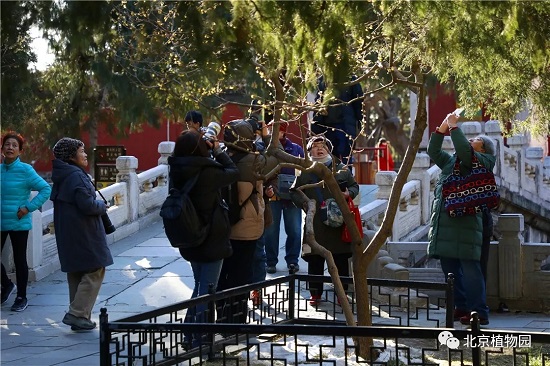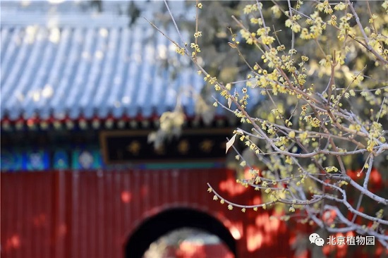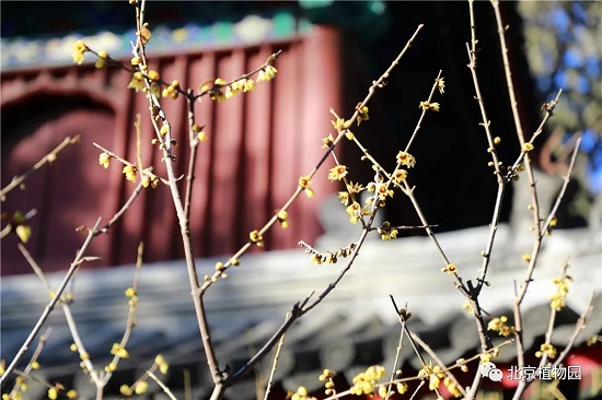 目前,北京植物园卧佛寺里的数株蜡梅正在盛花期,在如此寒冷的天气里,能够在室外欣赏到正在开放的花朵也是非常难得的。金黄色的小花在寒冷的冬季增添了一份亮丽的色彩,同时也为愈发临近的新春佳节带来一片幽香。其他品种的蜡梅也将在春节期间陆续开放,预计花期将持续至3月上旬。